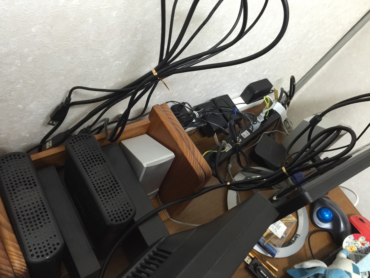 外付けHDDが4つとスピーカーとタコ足