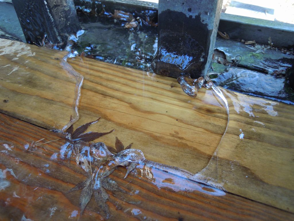 よーく見てみると、楓の枯れ葉が凍っている…