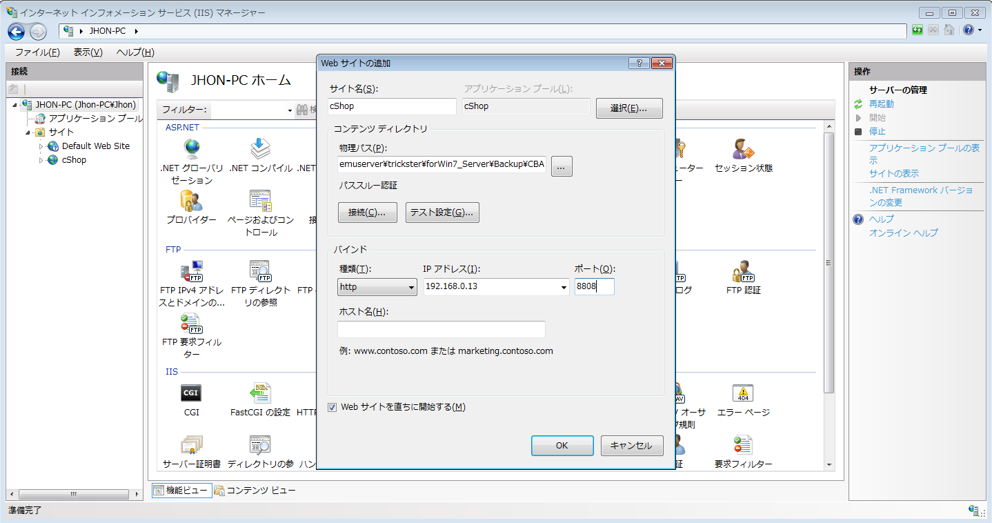 ISSを起動し、cShop内の「MIME の種類」を選択し、「.asp」を「application/x-asap」と定義。